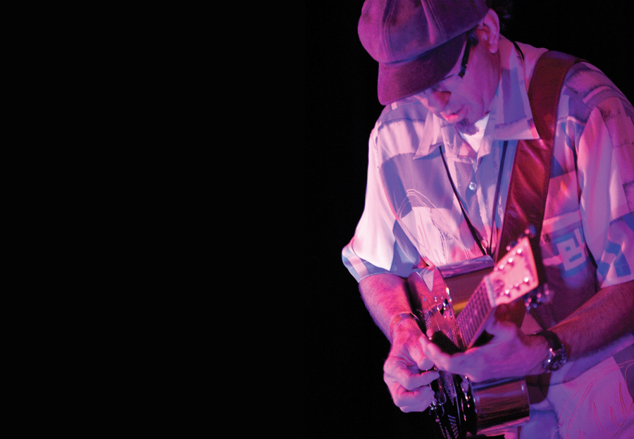 Guy is a guitar player of some accomplishment and a distinctive songwriter. On both acoustic and electric guitars he plays finger style, and is a fine bottleneck and slide player. His playing is not the flashy guitar-slinger style beloved of bluesrockers everywhere, but understated, and leaves room for the songs to make an impact, whether his own or the "covers" he performs that include many old standards and traditional tunes as well as songs by more recent American writers such as Eric Bibb or Kreig Viesselman.